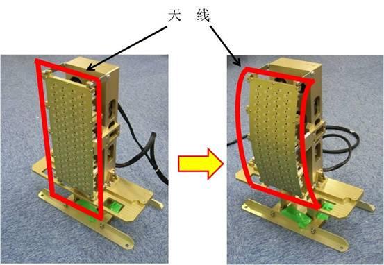 柔性天线试制的外观实物图(左边是平面状态,右边是最大弯曲状态),这个天线安装在内部的传感器能够检测弯天线弯曲的程度,根据天线形状自动进行修正来接收电波的方向。