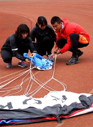 韩国代表队主伞飞掉捡回后,故障难以排除。中国八一跳伞队运动员主动相助,解了韩国运动员燃眉之急。(申进科)