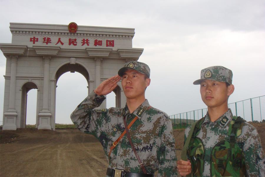 宝林(左一)国门致敬。(陈海波摄)