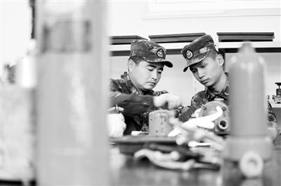 第二炮兵驻高原某部发射三营上士谢振虎(左),8次被评为“优秀士兵”,既是“兵教头”又是技术“大拿”。临近退伍,他向战友们传授绝活。(高飞虎 彭子健)