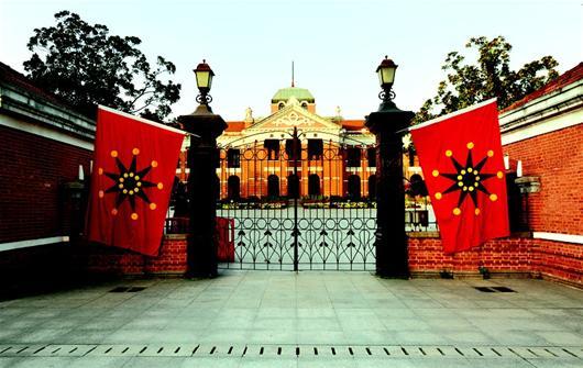 在武汉红楼——辛亥革命武昌起义纪念馆的大门前,每天张挂的两面“九角十八星旗”,使到此观瞻的每个人肃然起敬。