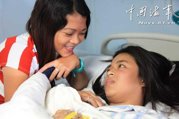 “感谢中国海军,治好了妹妹的腿,还为我们找回了丢失的物品!”玛丽索尔执意要求与医护人员合影,她说,姐妹俩又有了一张珍贵的照片,她们将永远珍存。