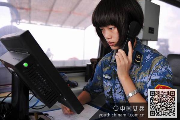 通信专业女舰员王姣姣在通信部位值更。