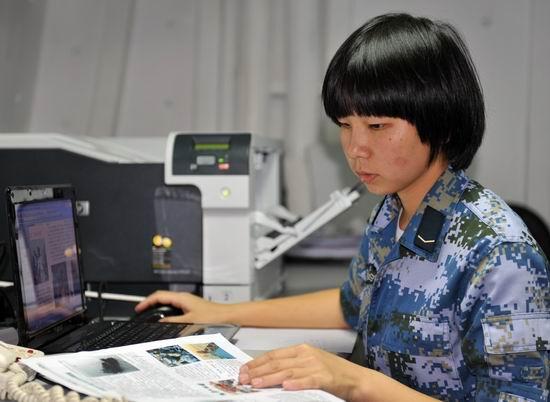 电子对抗专业女舰员彭琛正在排版编队的《井冈翠竹》报。