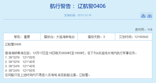 此前辽宁海事局网站相关航行警告截图