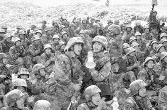 兰州军区某团战士拉练休息时演唱解放军军歌(图)