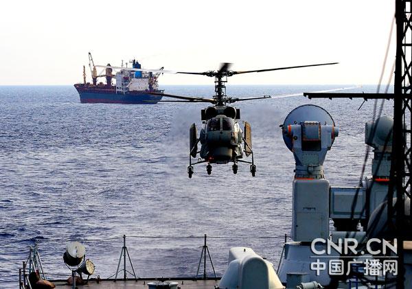 首批护航舰艇编队由南海舰队导弹驱逐舰“武汉”舰、“海口”舰、综合补给舰“微山湖”舰、2架舰载直升机以及数十名特战队员组成。2008年12月26日,从海南三亚军港起航。2009年4月28日完成护航任务回国,历时124天,先后为212艘船舶护航,解救遇袭船舶3艘,接护船舶1艘。中广军事记者孙利 摄