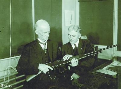 约翰·勃朗宁(左)在工厂检查枪械制造情况。