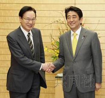 1月7日上午,日本首相安倍晋三向国家安全保障局首任局长谷内正太郎(左)交付任命书后与其握手。