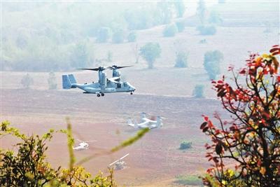 去年2月,美军“鱼鹰”直升机参加了2013“金色眼镜蛇”美泰联合军演实弹射击供图/中新