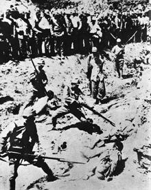 1937年12月13日,日本侵略者占领南京。在日本华中派遣军司令松井石根和第六师团师团长谷寿夫指挥下,日军使用集体枪杀、活埋、刀劈、火烧等惨绝人寰的手段,经6个星期的血腥屠杀,在南京杀害中国平民和被俘军人30万人以上。南京大屠杀是第二次世界大战中极端残暴的法西斯兽行。抗战胜利后,甲级战犯松井石根被远东国际军事法庭处以绞刑,谷寿夫被引渡给中国政府处死。这是日军在南京屠杀中国平民(资料照片)。新华社发