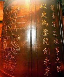 高3米、重6.6吨的“和平大钟”由启功先生书写钟名,钟体上刻有“前事不忘、后事之师”,“以史为鉴、开创未来”16个大字。