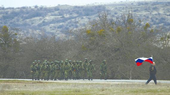 2日,一手持俄国旗的克里米亚当地人从一队武装人员身旁走过。