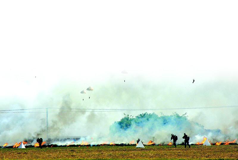 天上,飞机呼啸;不远处,炮声隆隆。4名队员沉着冷静:不到10分钟,一个“T”字形空降标示物铺设完成;一组气象侦测数据传出:空中合成风每秒5-6米,地面风每秒2-3米,风向东南……