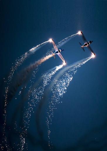 陈鹏:拍摄难度最大的是夜间,晚上是考验相机和人专业水平的时候。手持着600定焦“大炮”镜头,对着极暗光环境观察抓拍高速运动的飞机,还要定格从飞机上抛洒出来的烟花,这是多么具有挑战性的航摄难题。(牟健为)