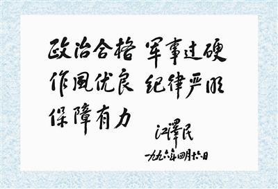 1996年4月16日,江泽民题词:政治合格 军事过硬 作风优良 纪律严明 保障有力
