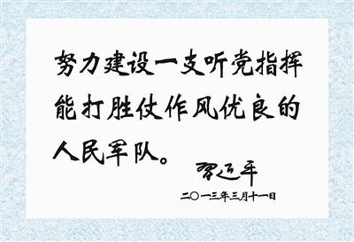 他指出,建设一支听党指挥、能打胜仗、作风优良的人民军队,是党在新形势下的强军目标。听党指挥是灵魂,决定军队建设的政治方向;能打胜仗是核心,反映军队的根本职能和军队建设的根本指向;作风优良是保证,关系军队的性质、宗旨、本色。全军要准确把握这一强军目标,用以统领军队建设、改革和军事斗争准备,努力把国防和军队建设提高到一个新水平。要铸牢听党指挥这个强军之魂,坚持党对军队绝对领导的根本原则和人民军队的根本宗旨不动摇,确保部队绝对忠诚、绝对纯洁、绝对可靠,一切行动听从党中央和中央军委指挥。要扭住能打仗、打胜仗这个强军之要,强化官兵当兵打仗、带兵打仗、练兵打仗思想,牢固树立战斗力这个唯一的根本的标准,按照打仗的要求搞建设、抓准备,确保部队召之即来、来之能战、战之必胜。作风优良是我军的鲜明特色和政治优势。要把改进作风工作引向深入,贯彻到军队建设和管理每个环节,真正在求实、务实、落实上下功夫,夯实依法治军、从严治军这个强军之基,保持人民军队长期形成的良好形象。