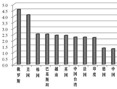 世界部分国家和地区军费占GDP比重图示