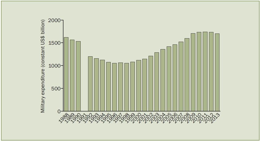图1 1988-2013年全球的军费支出(单位:十亿美元)