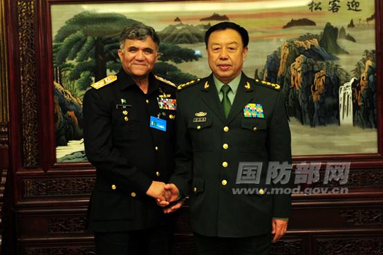 中新网4月23日电 据国防部网站报道,中央军委副主席范长龙上将23日下午在青岛会见了来华出席西太海军论坛第14届年会的巴基斯坦海军参谋长桑迪拉海军上将。(李晓伟摄)