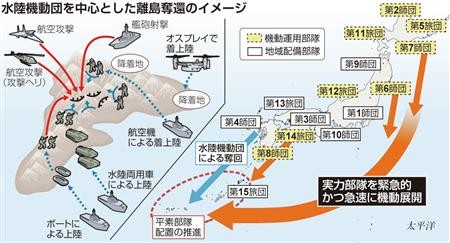 与此同时,日本自卫队还将其15个师团、旅团中的7个改变成了机动师团、旅团,以便于在发生紧急事件时可以迅速派兵前往西南,并新设了可以统一指挥日本全国陆上自卫队的“陆上总队司令部”。自卫队干部对此称“为了迅速进行大规模作战,指挥部队的‘大脑’是至关重要的”。