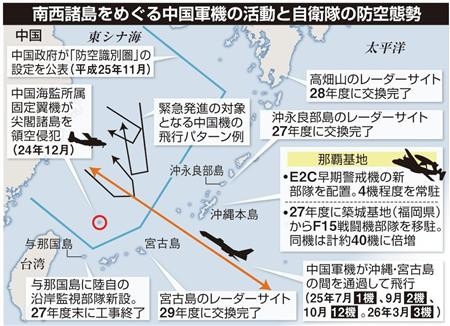 此外,宫古岛和冲永良部岛的地上雷达也将换成最新型号。某自卫队干部表示,如果雷达的可视性提高了,就能准确定位对方飞机。同时,原本在福冈筑城基地的最新战机F-15也将转移到那霸基地,目前,那霸所属的F-15战机已增加到了40架。