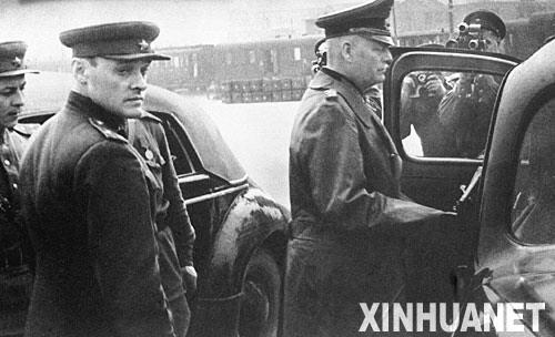 1945年5月7日,法西斯德国宣布无条件投降。这是1945年5月8日,德国陆军元帅、最高参谋长凯特利(右)代表德国前往签署德国无条件投降书的资料照片。 新华社发