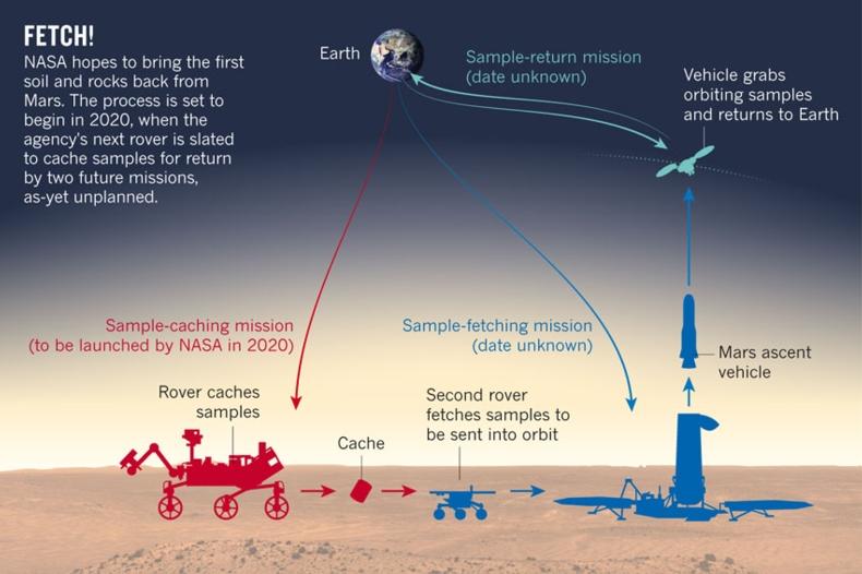 NASA的火星样本返回计划将涉及多年的一系列任务。第一阶段中,利用巡视探测器收集和存储约30小桶的岩石和土壤。在第二阶段,一颗无人运载火箭将飞到火星,释放另一台用来装在样本的巡视探测器,随后将样本运送至轨道。第三阶段是捕获装有样品的轨道包裹并将其返回地球。