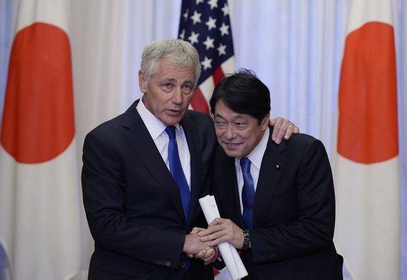 美国国防部长哈格尔(左)与日本防卫相小野寺五典(右)。