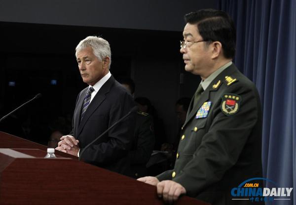 中国国防部长常万全在五角大楼与美国国防部长哈格尔(资料图)