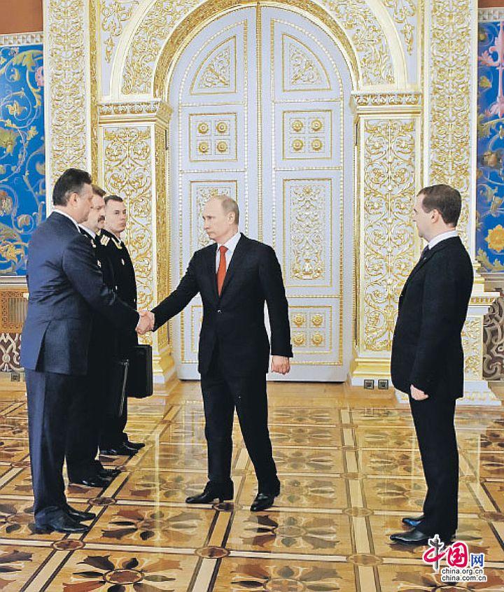 “核按钮”交接仪式。2012年,普京重返总统宝座之后,从前梅德韦杰夫手中接掌“核按钮”
