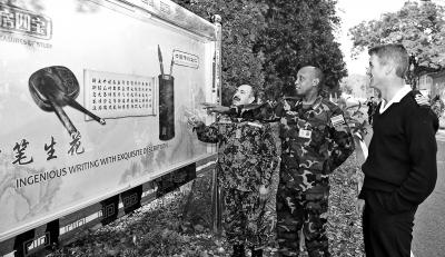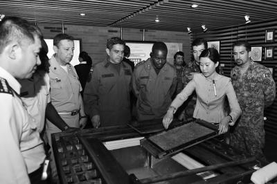 在中国军事浮雕展区,学员队陈参谋正向4名外军学员介绍“抗日战争”,这几名学员非常感兴趣。在军事浮雕的背面,呈现的是黄河壶口瀑布、青藏高原、阿里山等中国知名自然景观。陈参谋说,外军学员及其家属每天在院内散步时都会驻足观看,还有学员索要“文化长廊”的图片,说要装订成册带回国。
