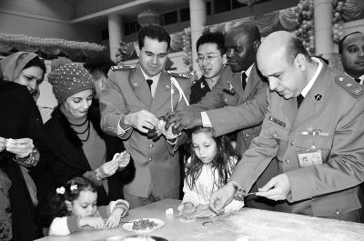 正在组织外军学员及其家属进行活动的政治处干事麻兰介绍说,外军学员对中国文化的兴趣度和需求度一直很高,学院开办的书画、刺绣、武术、针织、剪纸等10余个中国传统文化培训班很受欢迎,文体活动中心的书画室里,“友谊地久天长”、“和平鸽”、“牡丹花”等40余幅由外军学员或家属创作的书画作品,错落有致地张贴在展板上。