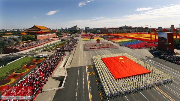 仪仗队高擎国庆游行历史上最大的五星红旗通过天安门广场。(资料图)
