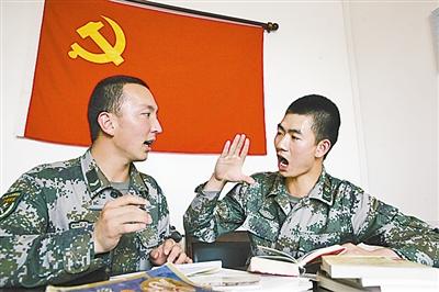 图①:班长彭希帮助少数民族战士阿伊登矫正汉字发音。