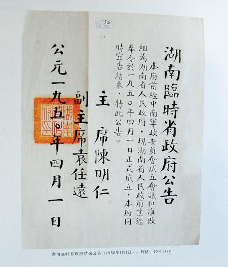 湖南临时省政府结束公告(1950年4月1日)。湖南省人民政府当日正式成立。