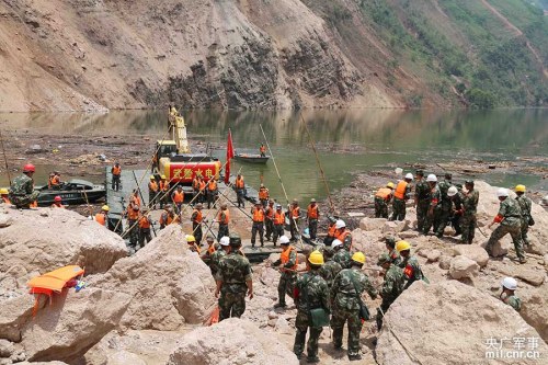 “8.03”大地震造成牛栏江两岸山体崩塌,并在李家山村红石岩社形成规模巨大的堰塞湖。据专家测量:牛栏江堰塞体堆积体高达96米,堰塞体顶部宽286米,长753米,堰塞湖总库容可达2.6亿立方米,对上下游近5000余群众生命财产造成严重威胁。抗震救灾指挥部决定同时开辟水陆两条救援通道,加紧减除堰塞险情,抢通水上救援通道的重任落在了国家级抗洪抢险专业应急力量——13集团军工兵团肩上。
