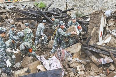 8月12日,云南省昭通军分区官兵和民兵在鲁甸县龙头山镇灾区清理废墟。鲁甸地震发生后,该军分区迅速启动应急预案,第一时间组织11个应急分队奔赴灾区展开救援。 本报记者 穆可双摄
