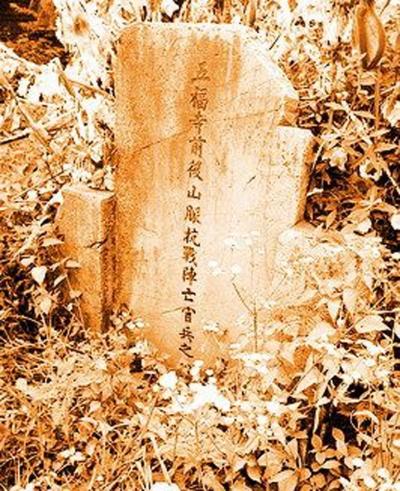墓碑高约1.5米、宽0.6米,掩映在青草与素洁小花之间,碑正中依稀分辨出“五福寺前后山脉抗战阵亡官兵之墓”字样,旁边有“中央陆军五十七师XXX”等字样。
