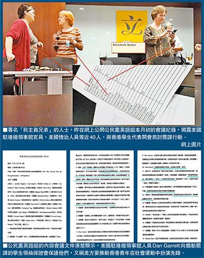 该人士上载4页会议记录及多张图片,显示会议由公民党主持,发起罢课的“学联”和“学民思潮”等均有代表出席。“学民”发言人周庭称,之前“反国教”有公民党帮忙才能成功,与其过去一直强调无政党介入明显有矛盾。 港大学生会会长梁丽帼称,参与罢课不仅包括本地学生,还包括内地和国际留学生。梁丽帼透露,壹传媒多次联系她,承诺给予资金支持。美国驻港总领馆官员、曾任职美国国防部和国家情报主任办公室的丹·盖瑞特称,“这次回美国向顶头上司汇报目前香港所处境况及我在港推动的工作进展。华盛顿要求继续在香港推动民间、社会力量争取民主诉求运动,尤其是推动青少年在社运扮演先锋角色”。他还承诺,“美国会保护学生领袖,包括赴外国留学、定居”。“本土行动”成员陈允中扬言,香港要争取民主,就必须暴力“企硬”、违法甚至流血,以迫使中央让步。他更带去一名中东难民,该难民声称会召集滞港的政治难民协助“占中”,如条件成熟会在港成立极端伊斯兰组织。“民主真兄弟”在文中直言,“学生领袖们是有退路的,泛民大佬就更有退路,只不过害了那帮不出名的孩子”。