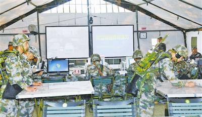 9月14日~15日,由总参军训部、动员部共同组织的民兵预备役高炮队伍第五场竞赛性考核在四川某预备役高炮师展开。图为首长机关运用某新型防空作战指挥系统进行指挥所演练的情形。通过该系统的辅助决策功能,从发现目标到完成火力打击,时间比原来缩短了1/3,使现有防空武器的抗击效率大大提高。曾庆芳摄