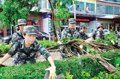 9月17日早上9时许,海南省军区某通信团组织100余名官兵奔赴海口市的大街小巷,帮助驻地群众抗风救灾,清除路障,恢复交通,整治城区环境卫生。图为该团刚入伍的新战士在救灾,因为还未授衔所以特殊的军装格外令人瞩目。
