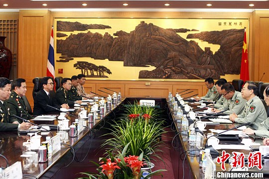 9月19日,中国人民解放军总参谋长房峰辉,在北京八一大楼与来访的泰国副总理兼外交部长、泰国武装部队最高司令塔纳萨举行会谈。中新社发 宋吉河 摄