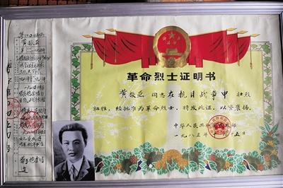 1985年,中华人民共和国民政部颁发的《革命烈士证明书》,正式认定黄振亚为革命烈士。 吴文生 摄