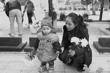 2012年2月17日,卜艳带着女儿给烈士墓献花。(资料图片)