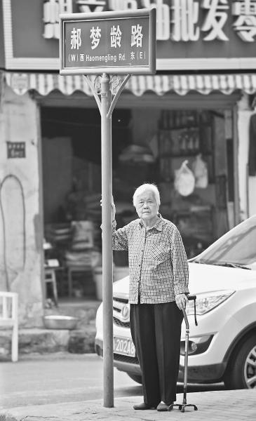 25日下午,93岁的郝慧英倚着“郝梦龄路”标示,缅怀父亲郝梦龄 见习记者郭良朔 摄