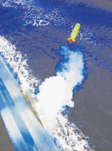 ▲ 演练中,徐州舰向水下目标发射鱼雷