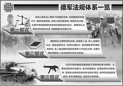 为防止重走二战老路,德国在上世纪50年代重建军队时确立了“文官统军”原则,同时以宪法《基本法》为基础,建立了一整套严谨正规的军队法规体系。据不完全统计,德军仅共同条令就超过100部,其他各军种的专业条令条例更是多如牛毛。严谨科学的法规体系明确了大至为谁当兵打仗、小到如何使用武器等问题,不仅保证了军令的畅通,也使部队战斗力有了可靠保障。德军法规体系大致可分为三个层次。