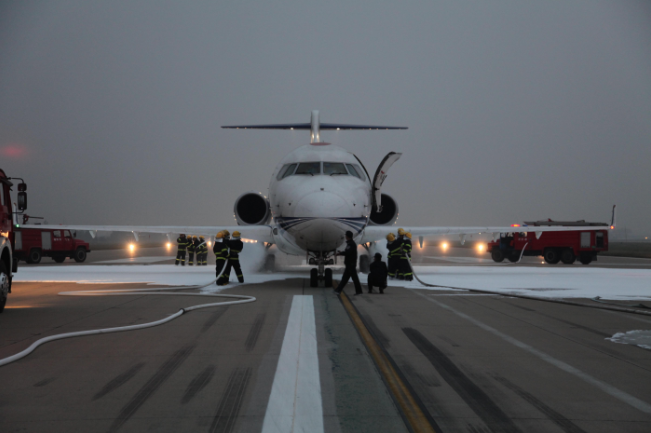根据适航条款的要求,在飞机完全停稳后的5分钟内不得采取任何消防措施,5分钟之后消防员才被允许接近飞机并对机轮和刹车盘进行降温处理。对此,上海飞机设计研究院李栋成解释说:"我们必须在试验中证明,燃烧仅限于轮胎、机轮和刹车装置,而不会发生在乘客和空勤人员撤离过程中火焰逐渐蔓延吞没飞机的其余部分。"