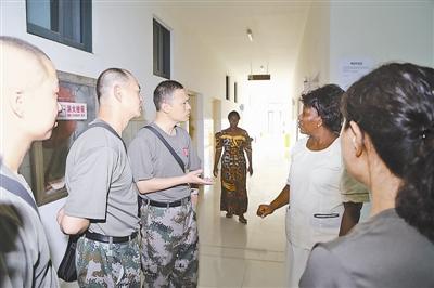 我军第二批援塞医疗队于当地时间11月15日抵达塞拉利昂后,医疗队员及时与中塞友好医院医护人员交流患者收治情况。 戴 欣摄